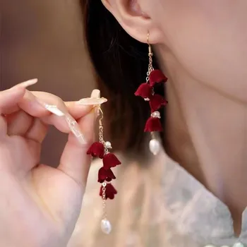 Vintage Wine Red Flocking Flower Drop Earrings For Women Jewelry 2025 Trending Long Bowknot Crystal Pearl Bridal Dress Earrings