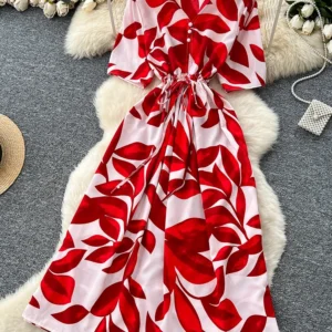 French Retro Floral Dress for Women’s Summer New Fashionable Prairie Chic V-neck Waist Cinched A-line Long Dress C170