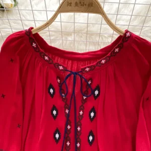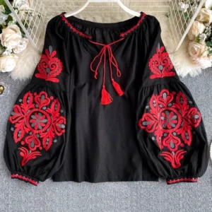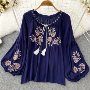 Women’s Retro Blouse National Style Embroidered Lace-Up Tassel V-Neck Lantern Sleeve Tops Loose All-Match Female Blusa PL536