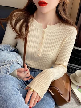 Female Casual Solid Long Sleeve Slim Knitted Sweater Autumn Winter 2025 New Women’s Retro Love Small Gold Buckle Cardigan