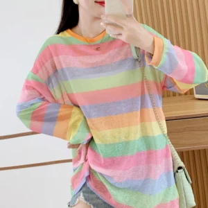Realistic Shooting of New Candy Colored Rainbow Striped Ice Silk Thin Sunscreen Women’s Shirt Top, Loose Summer Thin T-shirt B19