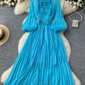 2025 Spring Autumn Fashion Elegant Dress for Women New French 3D Floral Single Breasted Chiffon Long Sleeve Long Dress C226