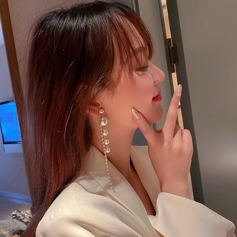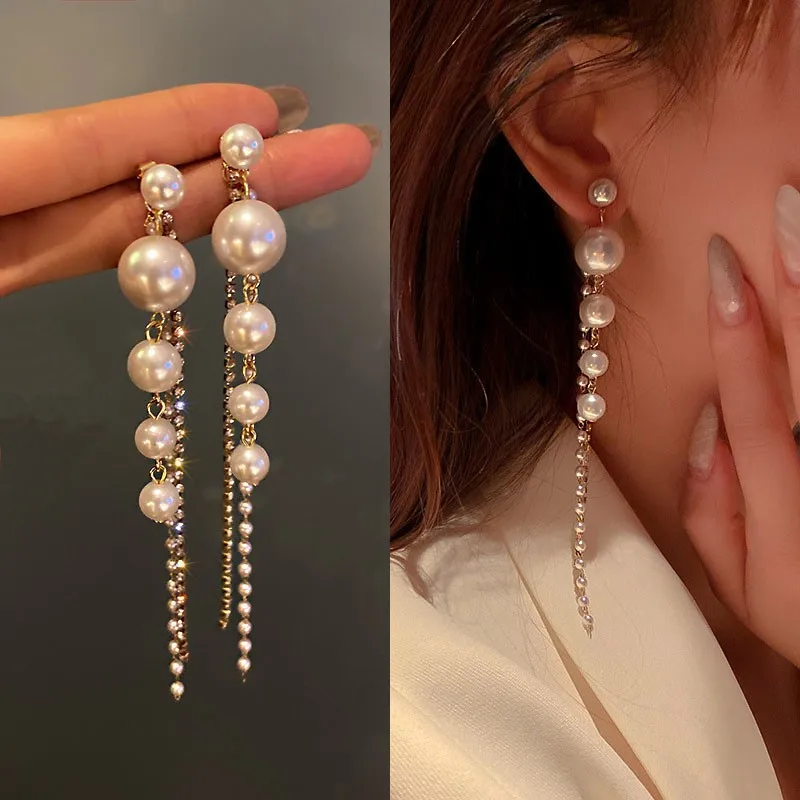 | Korean Fashion Earrings | Long Crystal Pearl Tassel Earrings Korean Fashion Women's Drop Earrings |