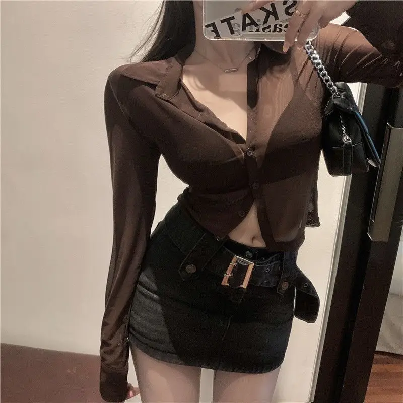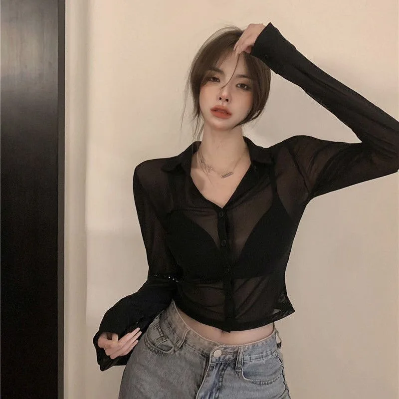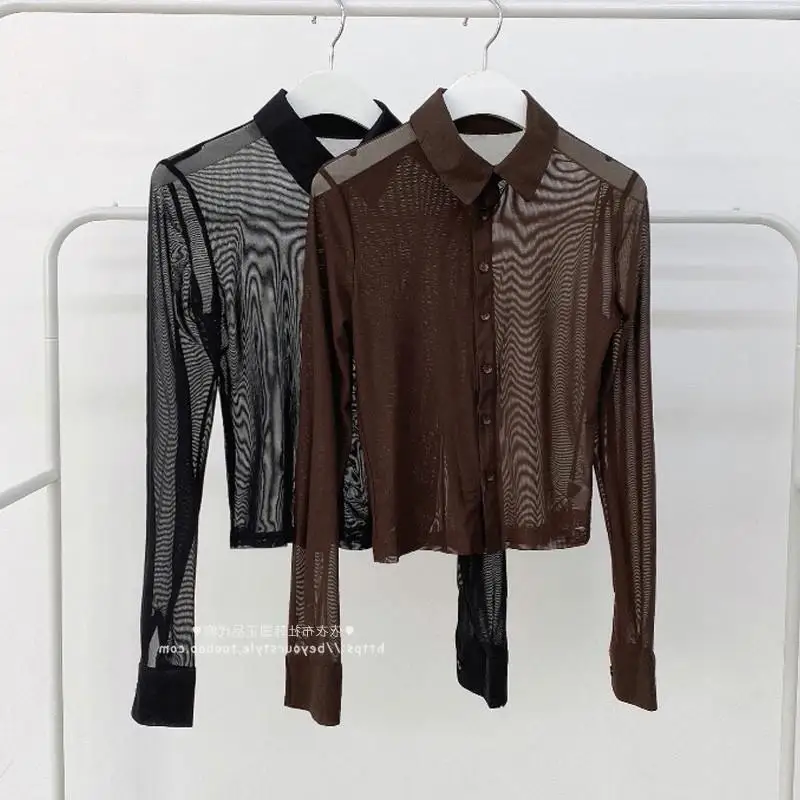 Y2K Women Mesh Sheer Blouse Chiffon See-through Long Sleeve Top Shirt Blouse Fashion Organza Transparent Shirt Female Blusas