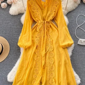 Spring Autumn Women’s Pleated V-neck Long Sleeved Dress Retro Lace Patchwork Waist Cinching Elegant Party Long Dress S159