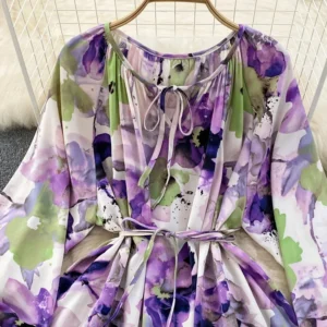 Spring Autumn Women’s Chiffon Long Sleeved Dress New Retro Lantern Sleeves Single Breasted Cinching Big Swing Long Dress J62