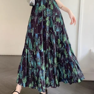 2025 Spring/summer New Korean Retro Contrasting Floral Skirt French Pleated Versatile Large Swing Long Skirt A270