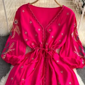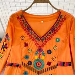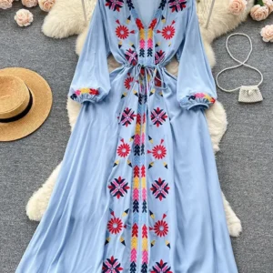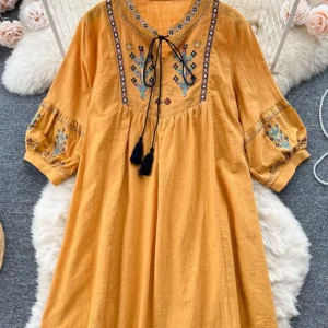 Women Summer Blouse Vintage Ethnic Embroidered Lace Up Blusa Artistic Splicing Loose Seven Quarter Sleeve V-neck Top BL095